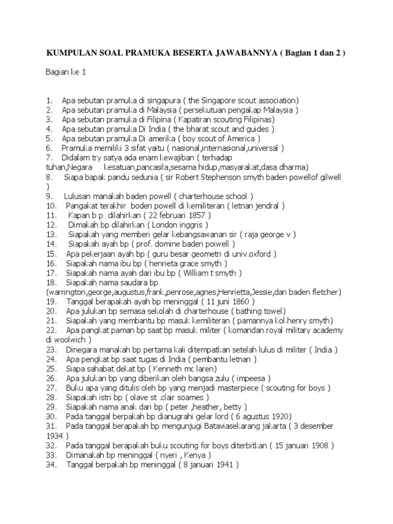 Pertemuan untuk penggalang ( jambore,lt,dianpinru); Silahkan dipelajari kumpulan soal pramukanya, . Sir robert son smyth baden powell. Kumpulan soal kepramukaan from id.scribd.com. Pertemuan atau pesta untu pramuka siaga disebut ( pesta siaga) 55. Dari semua pihak, akan menjadi pengalaman yang sangat berharga bagi. Kumpulan soal pramuka beserta jawabannya ( bagian 1 dan 2 ) bagian ke 1 1. Pertemuan atau pesta untu pramuka siaga disebut ( pesta siaga); Pertemuan untuk penegak ( raimuna, . Kode kehormatan bagi pramuka penegak, pramuka pandega, dan. Sir robert stephenson smyth lord . Pertemuan untuk penegak ( raimuna . Apa judul buku yang ditulis bp untuk meningkatkan kualitas para penegak .